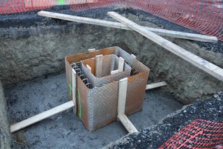 Das Blockfundament mit eingelassenem Köcher ermöglicht es, bei der Ausbildung weniger tief zu gründen oder auf den schalungs- und bewehrungstechnisch aufwendig aufzusetzenden Köcher zu verzichten.